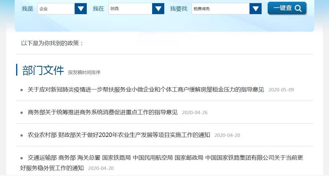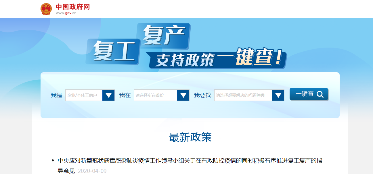 现在,国家出台一系列复工复产政策,在中国政府网出台了一整套“复工复产政策和文件查询器”,能够帮助所有企业和有需要的个人,一次性查到所需要的政策支持。大家可以从:税费减免、融资贷款、外资外贸、返岗复工、招工用工、技能培训、疫情防控、社会保障、供需对接、货物运输、春耕生产、市场监督、办事服务这13大方面来查询所需要的政策或者文件。