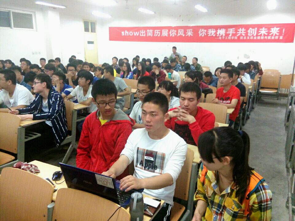 426日晚上19:00,在阎教楼1336自习室举行了由beat365中文官方网站职业规划与就业工作部主办的beat365中文官方网站第一届简历大赛。本次大赛邀请到了beat365中文官方网站大三本科辅导员庄思老师,大二专科辅导员张小妹老师,大一士官班教官敬超凡老师,以及大四已经与知名公司签约的田宇、冯雄博等几位学长作为嘉宾评委。beat365中文官方网站大一各班学生代表参加了此次大赛。