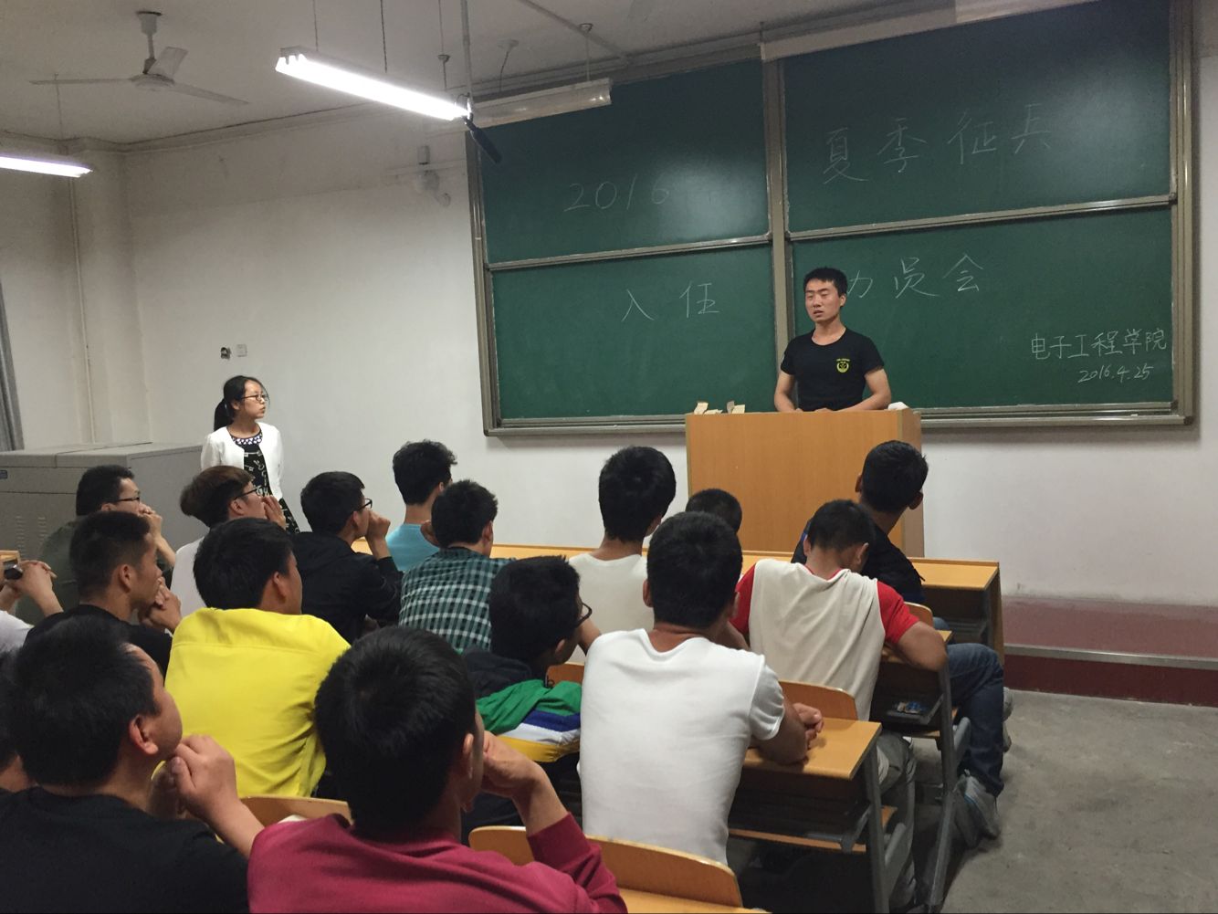 为宣传2016年夏季征兵工作,提高beat365中文官方网站学生应征入伍的积极性,我院特于4月25日晚八点在阎教1320教室进行了2016年夏季征兵入伍动员会。本次动员大会的主讲人为张小妹老师和退役士兵郭林林学长,我院各班班长与有入伍意向的学生参加了此次动员会。
