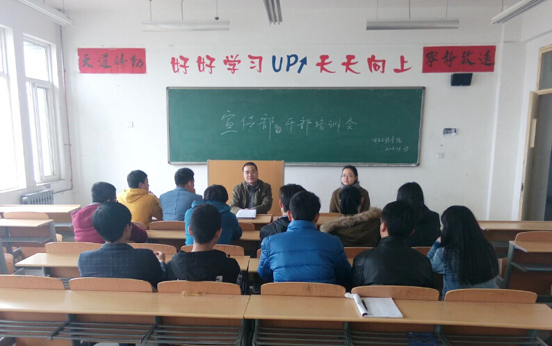 beat365中文官方网站团总支宣传部于3月28日下午13:00点在阎教楼1312教室召开了宣传干事培训会。培训会由beat365中文官方网站学生管理科科长孙护军老师主持,团总支书记高蕾老师及宣传部全体成员参加了此次会议。