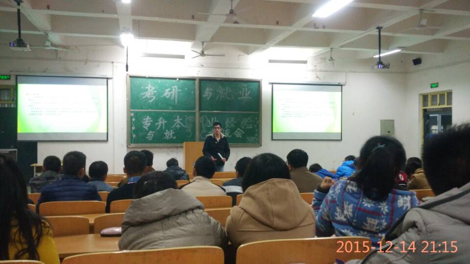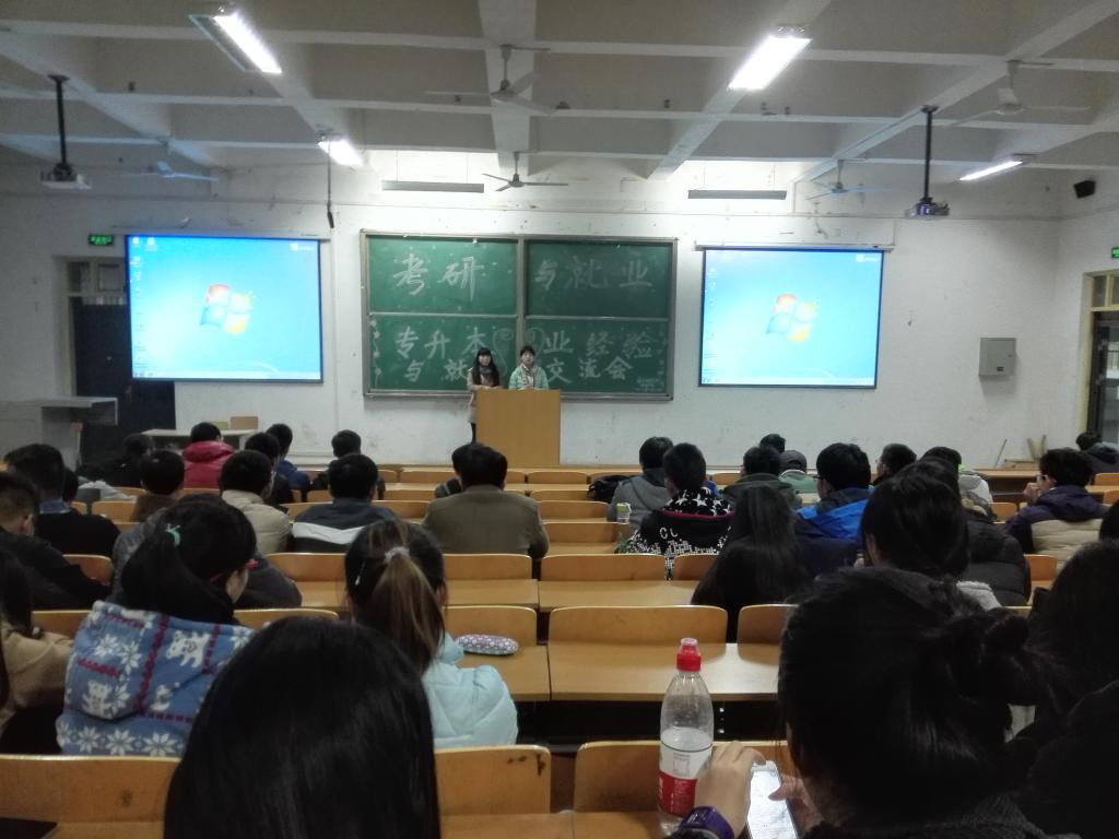 12月14日晚七点,在我校第五阶梯教室进行了一场针对我院大二学生的关于未来考研、就业以及专升本的经验交流会。本次活动由我院学生会秘书部主办,参会人员主要为我院大二学生。活动在部长陈敬霄简单致辞后正式开始。