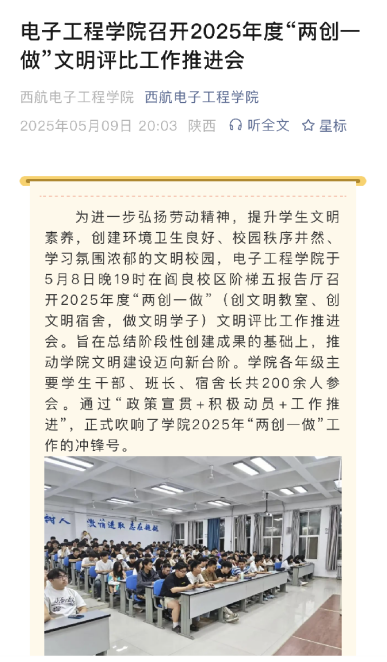 经过一个多月集中创建,学生文明意识显著提升,教室卫生在学校排名稳步上升,宿舍卫生改观明显,学生参与“两创一做”积极性高涨。同学们纷纷表示,将以此次会议为契机,积极响应学院号召,迅速行动起来,为打造文明、和谐、美丽的校园环境贡献自己的力量。(图、文/白颖怡 审核/李中)