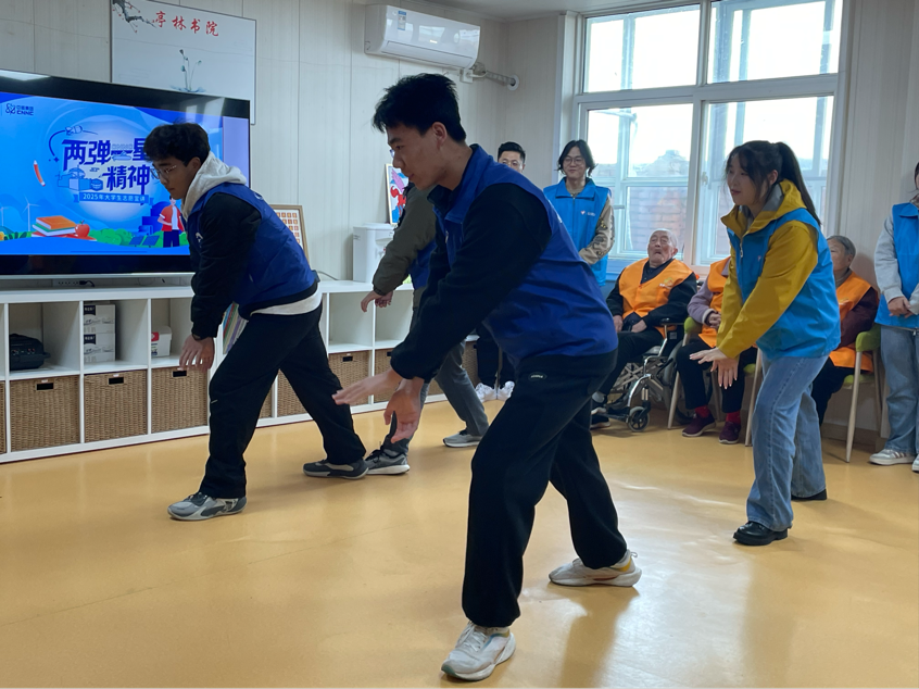 游戏休息环节,同学们为养老院的老人们献上了自己编排的曲目与知识盛宴。首先《强军战歌》激昂有力,激发了现场每一个人的爱国情怀。两首经典歌曲响彻活动现场,随后一首《外婆的澎湖湾》旋律轻快勾起了大家对美好生活的温馨回忆。歌声渐落,同学们巧妙地穿插“两弹一星”知识宣讲。他们用通俗易懂的语言,简要介绍了我国“两弹一星”事业的发展历程和辉煌成就,不仅让老人们感受到了现代科技的进步,也让同学们深刻体会到了科学技术对国家安全和社会发展的重要性。