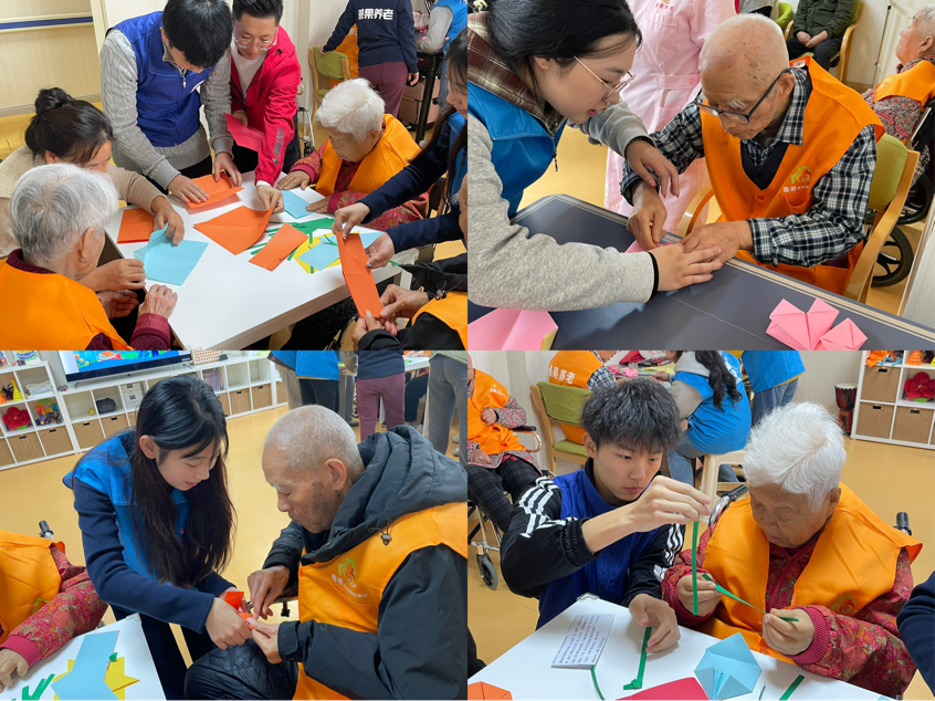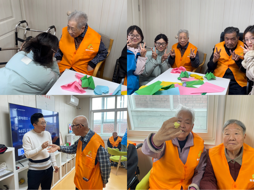 随后进入了温馨的艺术折纸环节。同学们围坐在爷爷奶奶身旁,多对一、耐心地指导他们折叠手中的彩纸。从简单的纸鹤到复杂的玫瑰花,每一步都充满了细致与热情。同学们还纷纷向爷爷奶奶们介绍自己拉近关系,亲切交流询问生活近况,分享彼此的故事与快乐。经过大家的团结协作,一张张彩纸幻化成栩栩如生的作品,不仅丰富了老人们的动手能力,更拉近了彼此之间心灵的距离,现场洋溢着浓浓的爱意。