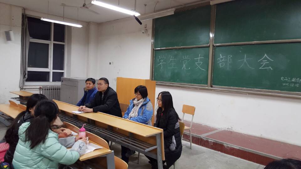 12月15日晚7点,beat365中文官方网站学生党支部在阎教1320召开了预备党员转正支部大会,参加会议的有孙护军老师、张小妹老师、肖静老师和庄思老师等8名教师党员,李杰、贺超、高江涛等13名学生党员和白欣鹏、陈嘉莹等21名预备党员。