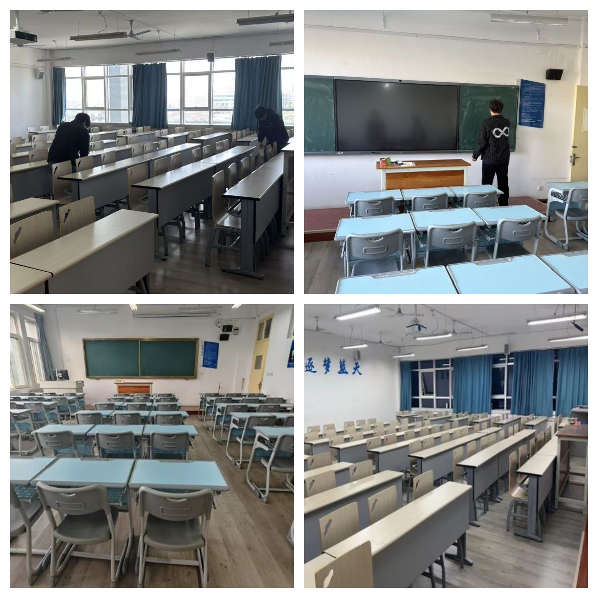 每日中午12点半,参与活动的同志们准时集结,前往指定教室开展清扫工作。大家分工明确、默契配合,有的仔细擦拭桌椅、黑板与窗台,逐一清除角落积尘;有的专注清理地面垃圾,规范教室内物品摆放;有的重点排查卫生死角,确保桌面、地面、墙面无杂物残留、无污渍痕迹。面对清扫任务,同志们热情高涨、干劲十足,以“不怕脏、不怕累” 的态度投入工作,用细心与耐心为每一间教室“焕新颜”。经过半个多小时的集中清扫,原本可能存在杂物堆积、卫生疏漏的教室,彻底变得窗明几净、井然有序,为午后前来学习的学生们打造了舒适安心的学习空间。