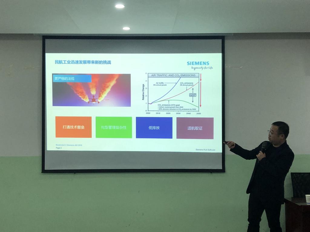 随后,刘松以“Simcenter助力飞机系统性能设计”为题,从Simcenter支撑飞机系统预测性分析、Simcenter Amensim仿真平台、航发性能样机(VIE)设计验证和虚拟集成飞机(VIA)设计验证等方面展开报告,介绍了软件被空中客车等著名航空公司的采用情况;王钰龙以“西门子Simcenter助力航空工业预测性工程分析”为题,详细介绍了Simcenter在模拟飞机起降设备分析与验证方面的功能,介绍了软件在中航工业研究所等单位的应用情况。会后,参会教师与两位主讲人热烈互动,并就软件功能向企业提出新的要求。