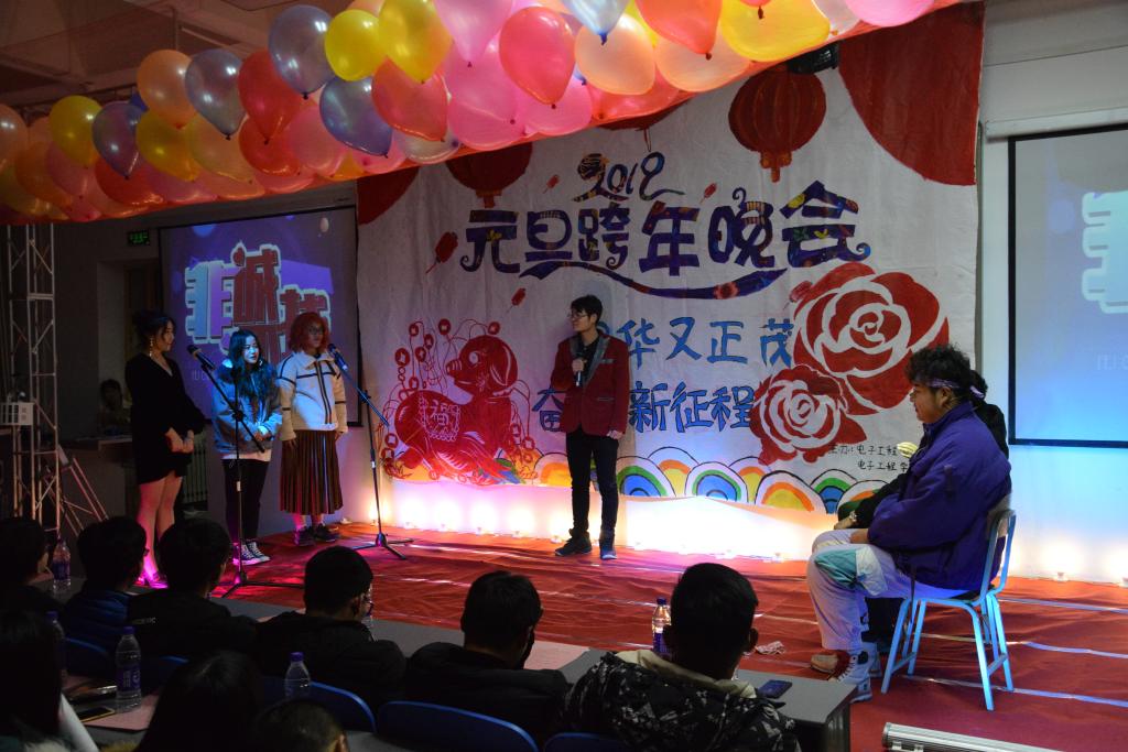2018年12月27日晚,beat365中文官方网站举办的“风华又正茂,放飞新征程”大型元旦晚会在阶梯五教室华丽上演,学生管理科科长孙护军,团总支书记肖静,大四辅导员高蕾,大二辅导员马晨以及大一辅导员赵嘉帅出席了此次晚会。主持人走上舞台,对到场的各位领导、老师、同学们表示热烈的欢迎,随后在全场观众热烈的掌中宣布元旦晚会正式开始。