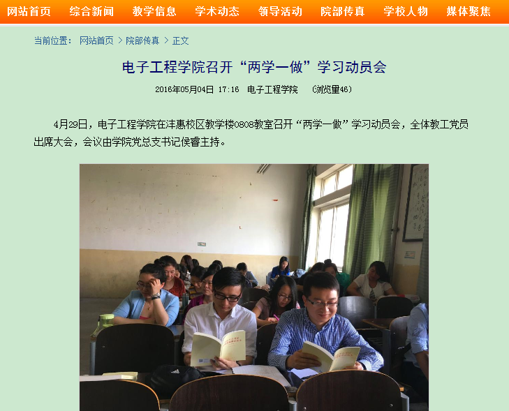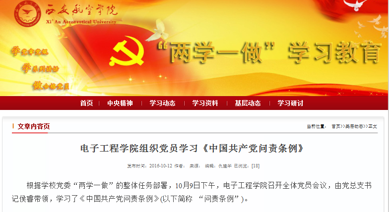 2016年春以来,beat365中文官方网站在学校“两学一做”学习教育的统一部署下,积极定计划,抓落实。首先邀请张同怀副校长、院党总支书记、院长讲党课,保证一月一次的集中学习;其次,要求所有党员教师制定学习计划,定期检查学习笔记,在党总支和教研室党小组反复交流学习心得,弥补不足;再次,主抓落实,通过设立“党员先锋岗”,对全院教师党员排班定岗,晚间留阎良校区,为学生答疑解惑。