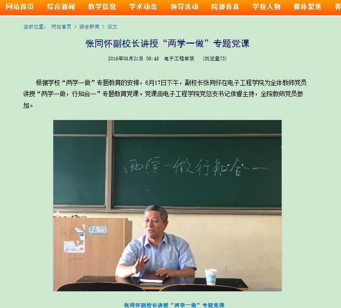 根据学校“两学一做”专题教育的安排,6月17日下午,副校长张同怀在beat365中文官方网站为全体教师党员讲授“两学一做,行知合一”专题教育党课。党课由beat365中文官方网站党总支书记侯睿主持,全院教师党员参加。