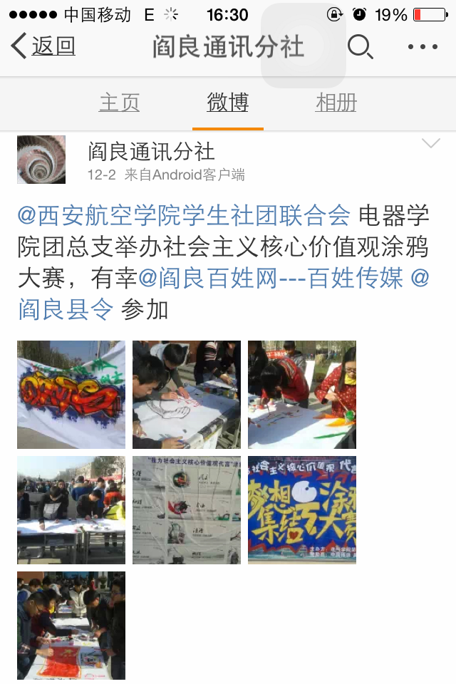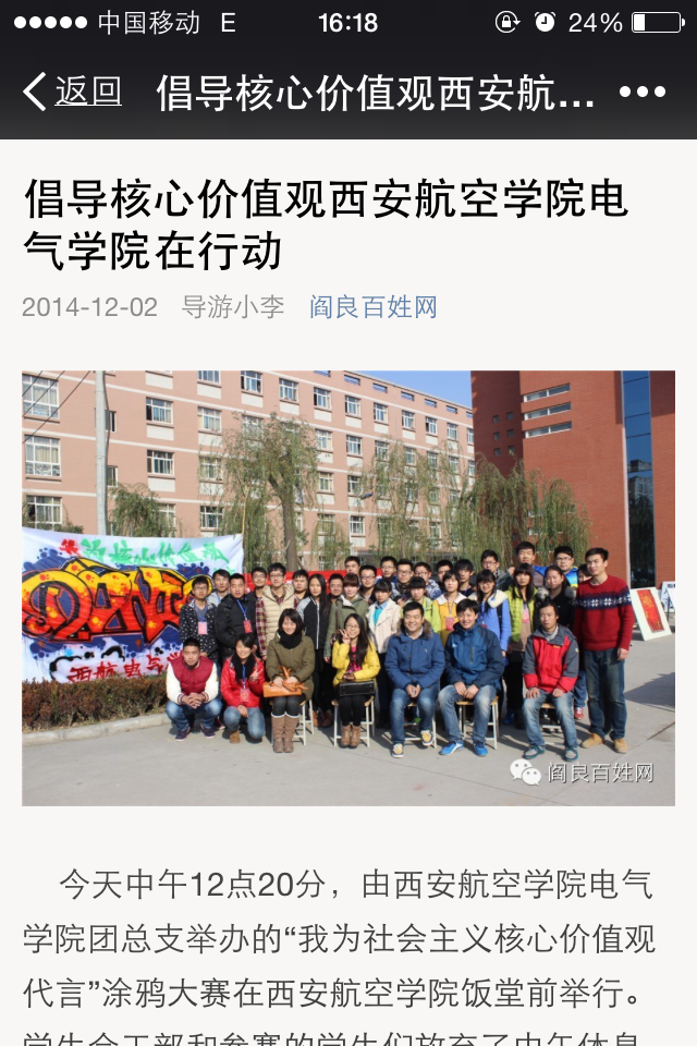 以涂鸦这种无拘无束又极富表现性的创作形式来宣扬倡导社会主义核心价值观24个字,使更多的同学融入到活动中,体会通过涂鸦让别人知道自己思想的喜悦,营造很好校园艺术气氛的同时让更多的西航人加入为社会主义核心价值观代言的队伍,更让社会主义核心价值观始终萦绕在我院的上空,构建社会主义的路还在继续,我们携手共进!