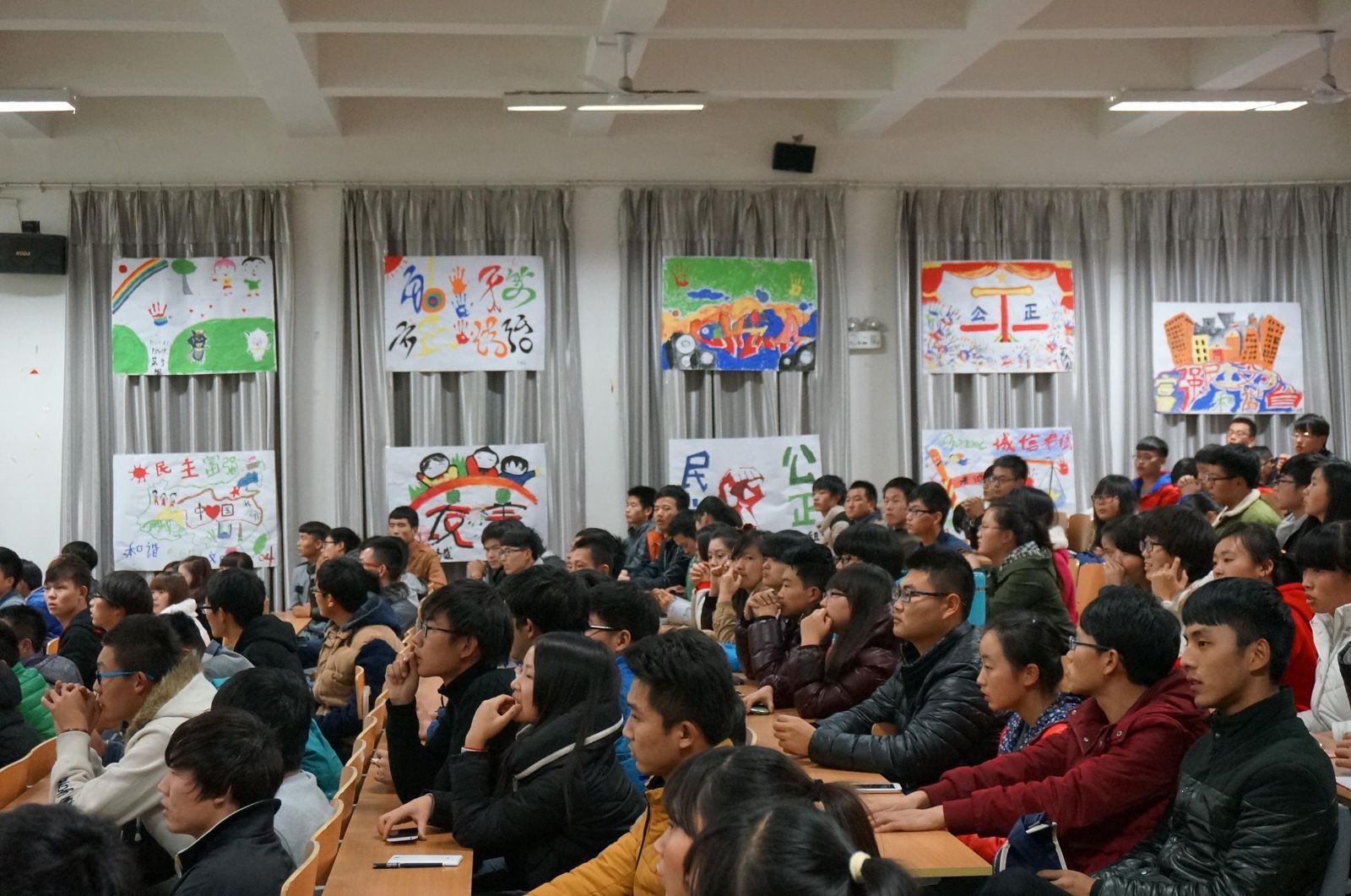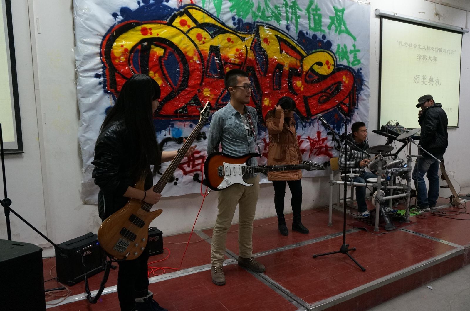 本次晚会以乐队演唱的方式拉开帷幕,全场沸腾,气氛热烈。主持人介绍本次比赛结果投票数由院团总支微信公众平台和现场两部分组成,各占百分之五十。然后由各参赛选手的对自己的涂鸦作品进行创作灵感和对社会主义核心价值观理解的阐述后,由到场同学开始投票。在激烈的投票过中,文艺部进行了才艺表演,又将现场气氛带到了高潮。通过现场计票统计结果,选出包括三组最佳奖在内的一二三等奖共九组获奖作品,最后我院党委书记、院长杨勇老师总结大赛发表讲话,为期九天的活动圆满闭幕。