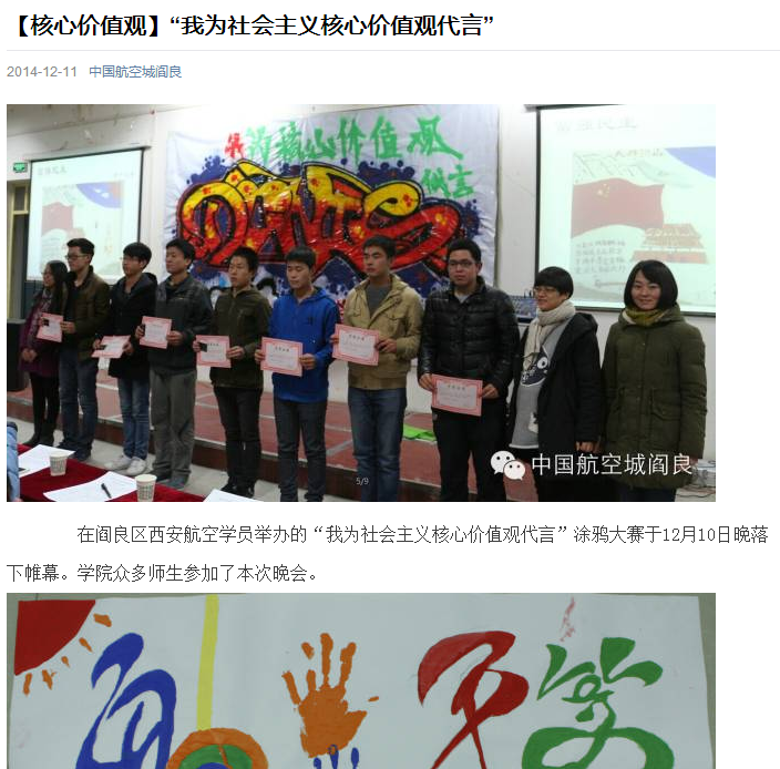 我院团总支积极响应校团委关于“我为社会主义核心价值观代言”活动安排,由我院团总支主办,团总支秘书部和学生会秘书部承办,院团总支宣传部、学生会宣传部和青协中队协办的“我为社会主义核心价值观代言”涂鸦大赛于12月10日晚在我校阎良校区阶五落下帷幕。我院党总支书记、院长杨勇老师,校团委季林健老师、我院团总支书记葛昊老师、殷娇老师、张小妹老师、肖静老师、马晨老师及我院团总支,学生会,心灵驿站学生干部出席本次晚会,第十期入党积极分子以及学生代表参加了本次晚会。