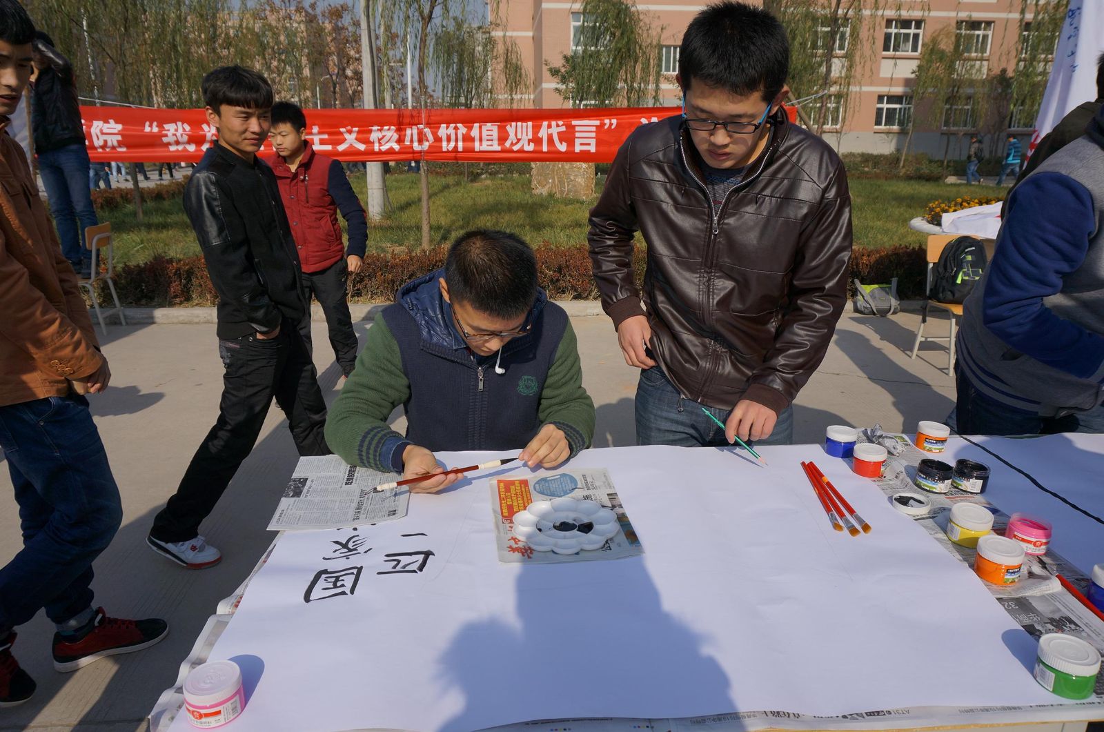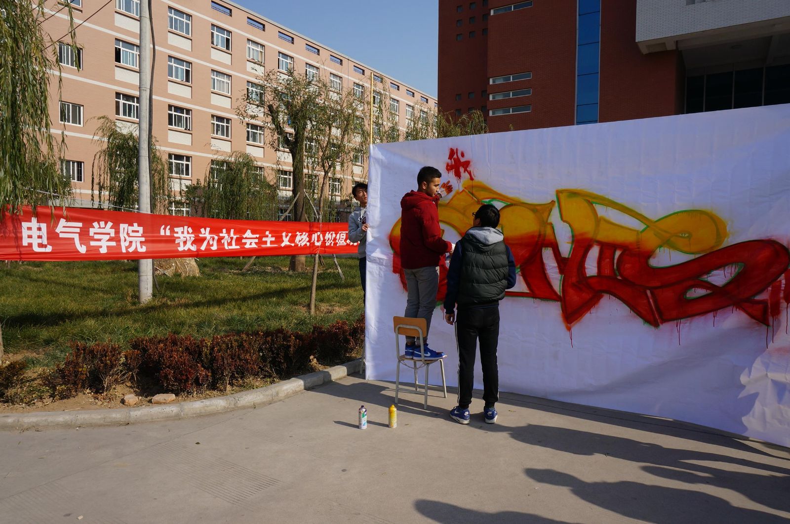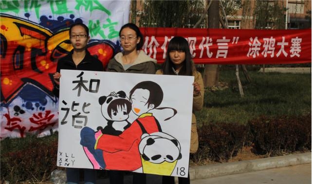 由我院团总支主办,我院团总支秘书部和学生会秘书部承办,院团总支宣传部和学生会宣传部、青协中队协办的“我为社会主义核心价值观代言”涂鸦大赛于12月2日中午12点在饭堂十字隆重开赛。本次活动是我院团总支为积极响应校团委号召,更好的弘扬社会主义核心价值观,让社会主义核心价值观精神发扬光大,而举行的为期20天的“我为社会主义核心价值观代言”系列活动中最重要的的一项活动。