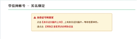 填写身份证号后提示“证件号码已被注册,查看解决方法”,表明系统已有可用的帐号使用该身份证号码进行了注册,如学生曾使用该身份证号码注册过帐号,可通过原用户名登录并使用系统。如学生本人确未使用过该身份证号码注册过帐号,可继续使用该身份证号码进行基本信息填写,完成其他信息项填写后点击完成注册。系统会在基本信息填写完成后要求学生本人上传身份证照片,进入客服审核身份信息阶段。待客服审核通过后才能进行其他操作。客服审核通过后,注销使用该证件号码的其他帐号(请慎重操作)。