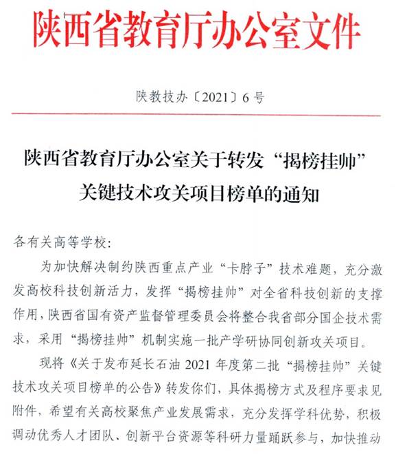 陕西省教育厅办公室关于转发“揭榜挂帅”关键技术攻关项目榜单的通知
