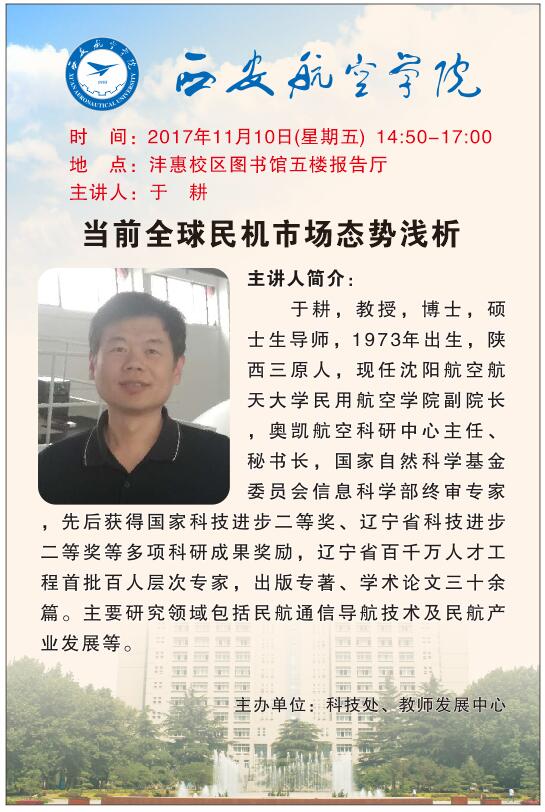 为促进学术交流,营造学术氛围,便于师生了解和把握民机市场的全球现状及发展趋势,科技处特邀沈阳航空航天大学民用航空学院副院长、奥凯航空科研中心主任于耕教授来我校作题为“当前全球民机市场态势浅析”的学术讲座,欢迎广大师生踊跃参加。现将相关事项通知如下: