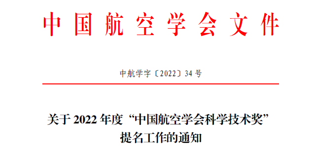 中国航空学会(中航学字〔2022〕34 号)印发关于2022 年度“中国航空学会科学技术奖”提名工作的通知,通知见附件。